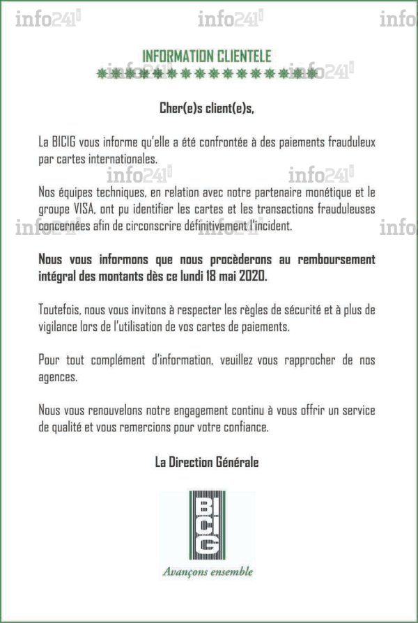 La banque attaquée a vivement réagit ce lundi via un communiqué adressé à ses clients. Elle confirme avoir « été confrontée à des retraits frauduleux par cartes de paiements internationales ». Se voulant rassurante malgré cet incident d’une ampleur inégalée, BICIG martèle : "Nos équipes techniques en relation avec notre partenaire monétique et le groupe VISA, ont pu identifier les cartes et les transactions frauduleuses concernées afin de circonscrire définitivement l’incident". Avant de promettre qu’elle effectuera le « remboursement intégral des montants dès ce lundi 18 mai 2020 ».