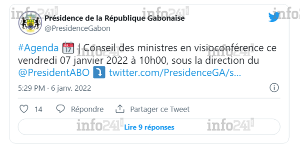 Où est passé le conseil des ministres du 7 janvier 2022 ? Pourtant dès jeudi après-midi et jusqu’à un peu plus tard dans la soirée, l’information avait été donnée par les canaux habituels de la Présidence gabonaise. Ce conseil des ministres devrait avoir lieu ce vendredi à 10h00 toujours par visioconférence, indiquait la Présidence gabonaise notamment sur Facebook et Twitter. Une annonce supprimée le vendredi sans qu’aucune explication ne soit donnée.