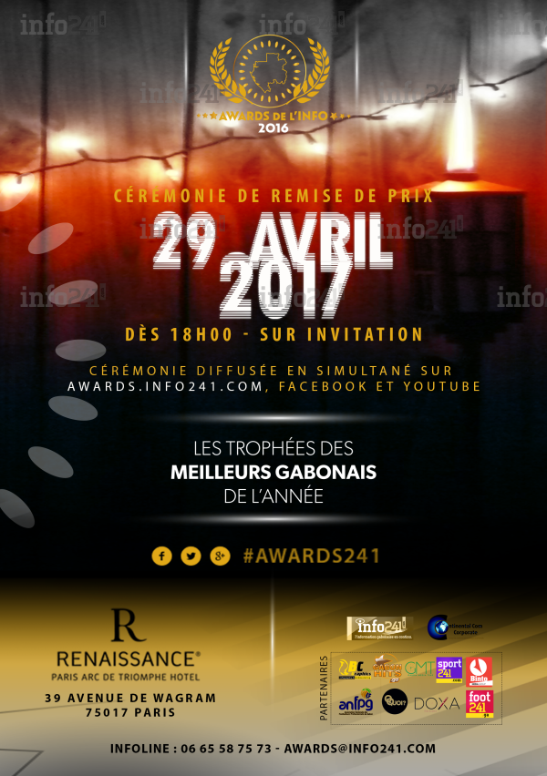Notons que la cérémonie de remise de prix débutera dès 18h00 (17h heure de Libreville) et devrait réserver plein de surprises aux internautes, unique jury de ces récompenses annuelles. Les places étant limitées, l’accès à la cérémonie parisienne qui aura lieu dans le 17e arrondissement près de l’Arc de triomphe, se fait sur invitation. Celle-ci peut être obtenue sur simple demande au comité des Awards en adressant un mail avec vos cordonnées à awards@info241.com.