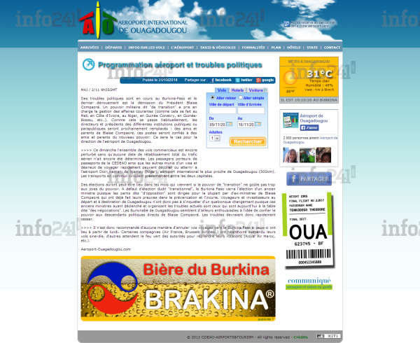 Les responsables de l’aéroport international de Ouagadougou ont une lecture particulière des récents troubles que traverse le pays. Dans un communiqué-coup de gueule publié le 31 octobre sur son site internet, l’aéroport à tenu à rassurer les voyageurs sur la situation politique et prédit des nominations prochaines à la direction de cet aéroport.