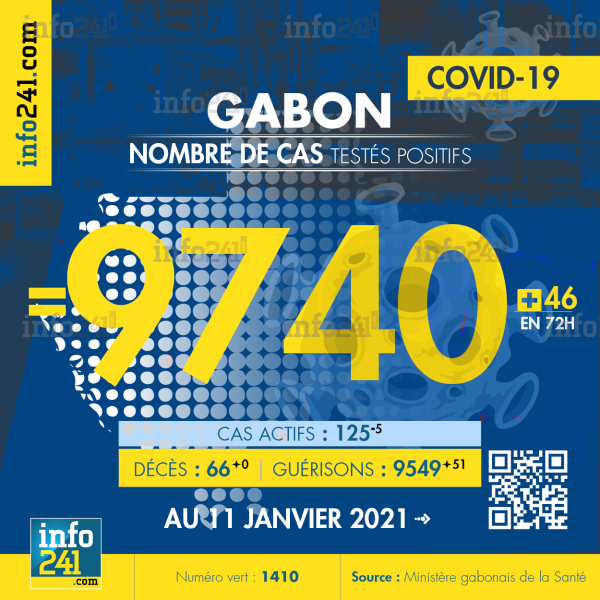Ce qui porte le bilan à 9 740 cas confirmés, 66 décès et 9 549 guérisons. Le Gabon compte actuellement 125(-5) cas actifs de la pandémie officiellement déclarés. Parmi eux 4(-2) patients hospitalisés dans le pays dont 4(-2) en réanimation.