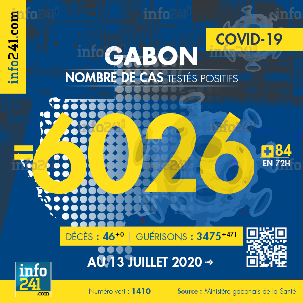 Bilan épidémiologique du Gabon au 13 juillet 2020 : 84 nouveaux cas enregistrés en 72h dans l’Estuaire (70 cas), Ogooué-Maritime (7 cas), le Haut-Ogooué (1 cas), la Nyanga (3 cas), la Ngounié (1 cas) et le Woleu-Ntem (2 cas). Il y a eu aucun nouveau décès et 471 nouvelles guérisons. Ce qui porte le bilan à 6 026 cas confirmés, 46 décès et 3 475 guérisons. Il y a actuellement 2 505 cas actifs. Parmi eux 43(+4) patients hospitalisés dans le pays dont 11(+1) en réanimation.
