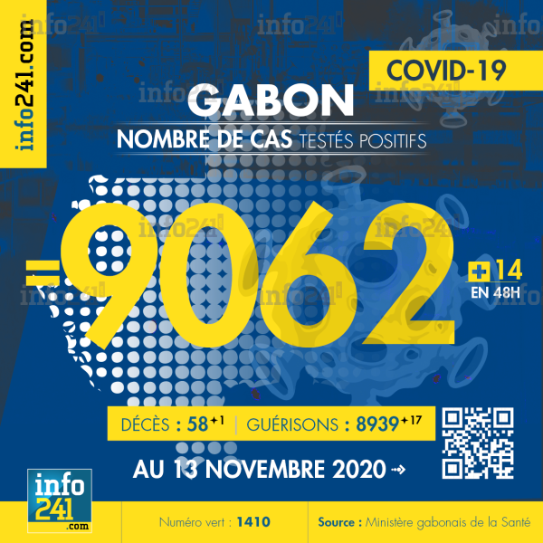Ce qui porte le bilan à 9 062 cas confirmés, 58 décès et 8 939 guérisons. Le Gabon compte actuellement 65(-4) cas actifs de la pandémie officiellement déclarés. Parmi eux 10+2) patients hospitalisés dans le pays dont 7(-1) en réanimation.