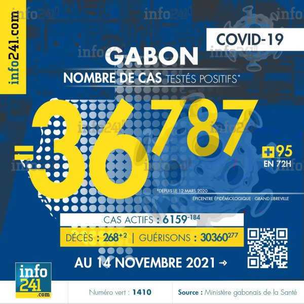 Bilan épidémiologique du Gabon au 14 novembre 2021 : 95 nouveaux cas enregistrés en 72h dans l’Estuaire (81 cas), l’Ogooué-Maritime (8 cas), l’Ogooué-Ivindo (3 cas) et le Woleu-Ntem (3 cas). Il y a eu 2 nouveaux décès et 277 nouvelles guérisons.