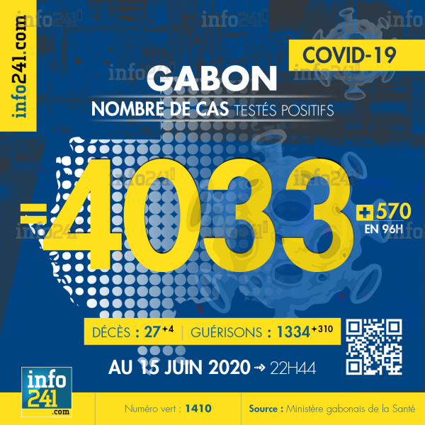 Le bilan épidémiologique du Gabon au 15 juin : 570 nouveaux cas enregistrés en 96h dans l’Estuaire (385 cas), Haut-Ogooué (133 cas), l’Ogooué-Lolo (3 cas), l’Ogooué-Ivindo (6 cas), Woleu-Ntem (22 cas) et le Moyen-Ogooué (21 cas). Il y a eu 4 nouveaux décès à Libreville, Franceville (2 morts) et Lambéréné et 310 nouvelles guérisons. Ce qui porte le bilan à 4 033 cas confirmés, 27 décès et 1 334 guérisons. Il y a actuellement 96(+13) patients hospitalisés dans le pays dont 15 (-2) en réanimation.