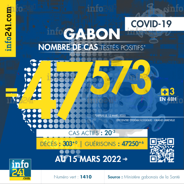 Bilan épidémiologique du Gabon au 15 mars 2022 : 3 nouveaux cas enregistrés en 48h dans l’Ogooué-Maritime (2 cas) et l’Estuaire (1 cas). Il y a eu aucun nouveau décès et 6 nouvelles guérisons.