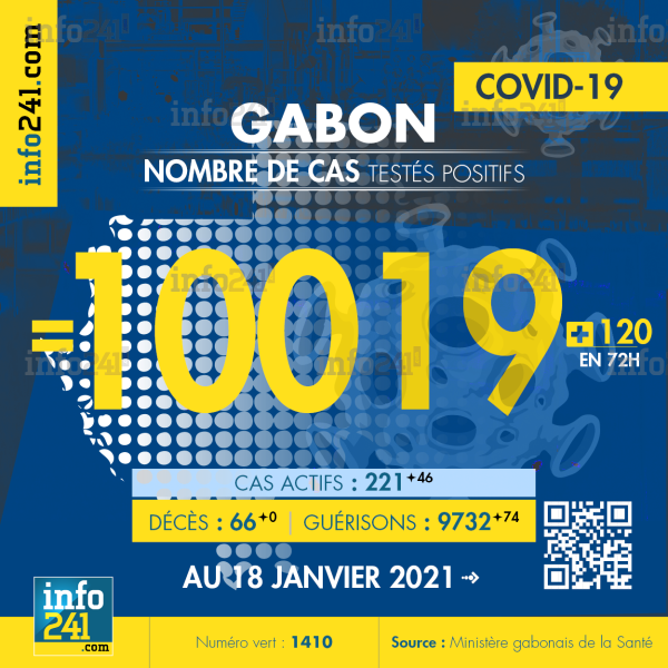Ce qui porte le bilan à 10 019 cas confirmés, 66 décès et 9 732 guérisons. Le Gabon compte actuellement 221(+46) cas actifs de la pandémie officiellement déclarés. Parmi eux 17(+3) patients hospitalisés dans le pays dont 11(+1) en réanimation.