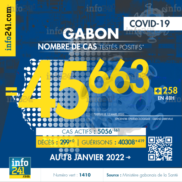 Bilan épidémiologique du Gabon au 18 janvier 2022 : 258 nouveaux cas enregistrés en 48h dans l’Ogooué-Maritime (138 cas), l’Estuaire (101 cas), le Moyen-Ogooué (12 cas), le Haut-Ogooué (7 cas), l’Ogooué-Ivindo (2 cas) et la Nyanga (1 cas). Il y a eu aucun nouveau décès et 419 nouvelles guérisons.
