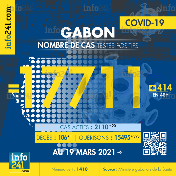 Ce qui porte le bilan à 17 711 cas confirmés, 106 décès et 15 495 guérisons. Le Gabon compte actuellement 2 090 (+26) cas actifs de la pandémie officiellement déclarés. Parmi eux 100(+5) patients hospitalisés dans le pays dont 31(+11) en réanimation.