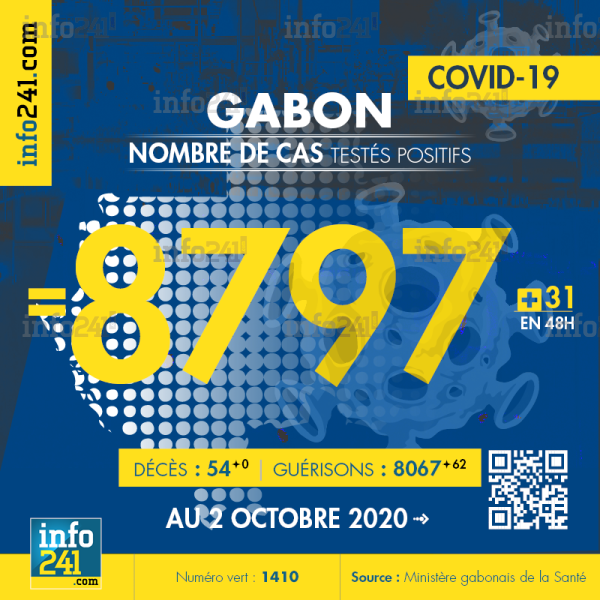 Ce qui porte le bilan à 8 797 cas confirmés, 54 décès et 8 067 guérisons. Le Gabon compte actuellement 676(-67) cas actifs de la pandémie officiellement déclarés. Parmi eux 3(-1) patients hospitalisés dans le pays dont 3(-1) en réanimation.