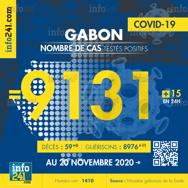 Bilan épidémiologique du Gabon au 20 novembre 2020 : 15 nouveaux cas enregistrés en 24h dans l’Estuaire (14 cas) et le Moyen-Ogooué (1 cas). Il y a eu aucun nouveau décès et 11 nouvelles guérisons.