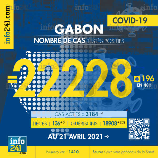 Ce qui porte le bilan à 22 228 cas confirmés, 136 décès et 18 908 guérisons. Le Gabon compte actuellement 3 184(-6) cas actifs de la pandémie officiellement déclarés. Parmi eux 92(+2) patients hospitalisés dans le pays dont 28(-6) en réanimation.
