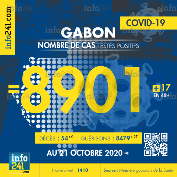 Bilan épidémiologique du Gabon au 21 octobre 2020 : 17 nouveaux cas enregistrés en 48h dans l’Estuaire (11 cas) et l’Ogooué-Lolo (6 cas). Il y a eu aucun nouveau décès et 27 nouvelles guérisons.