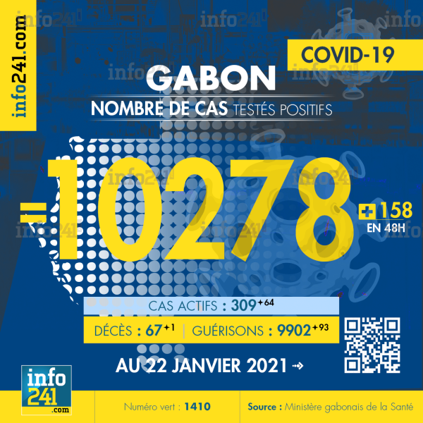 Bilan épidémiologique du Gabon au 22 janvier 2021 : 158 nouveaux cas enregistrés en 48h dans l’Estuaire (125 cas), l’Ogooué-Maritime (30 cas) et le Haut-Ogooué (3 cas). Il y a eu un nouveau décès et 93 nouvelles guérisons.