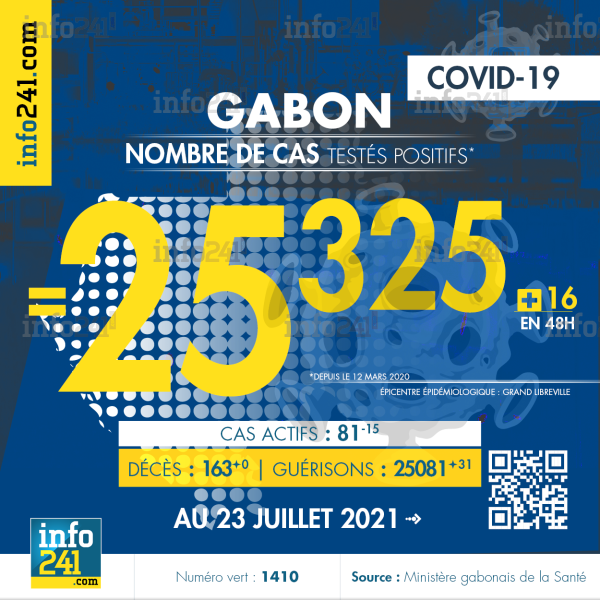 Ce qui porte le bilan à 25 325 cas confirmés, 163 décès et 25 081 guérisons. Le Gabon compte actuellement 81 (-15) cas actifs de la pandémie officiellement déclarés. Parmi eux 12 (-3) patients hospitalisés dans le pays dont 3 (-3) en réanimation.