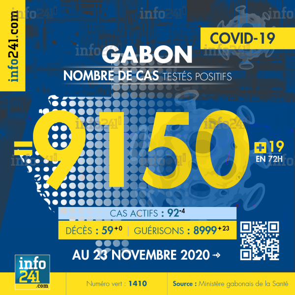 Ce qui porte le bilan à 9 150 cas confirmés, 59 décès et 8 999 guérisons. Le Gabon compte actuellement 92(-4) cas actifs de la pandémie officiellement déclarés. Parmi eux 9(+5) patients hospitalisés dans le pays dont 8(+5) en réanimation.