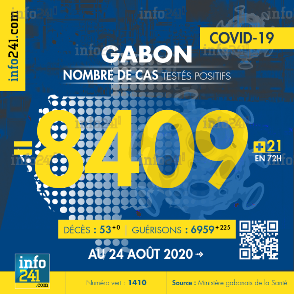 Ce qui porte le bilan à 8 409 cas confirmés, 53 décès et 6 959 guérisons. Le Gabon compte actuellement 1 397 cas actifs de la pandémie officiellement déclarés. Parmi eux 30(+0) patients hospitalisés dans le pays dont 2(+0) en réanimation.