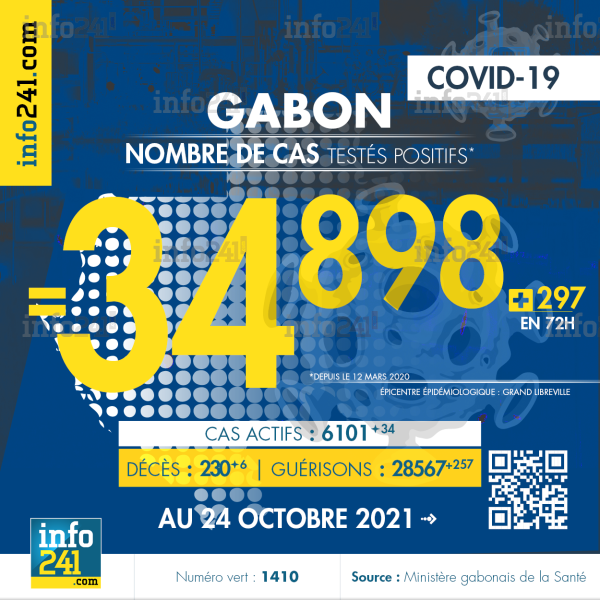 Ce qui porte le bilan à 34 898 cas confirmés, 230 décès et 28 567 guérisons. Le Gabon compte actuellement 6 101 (+34) cas actifs de la pandémie officiellement déclarés. Parmi eux 114 (+3) patients hospitalisés dans le pays dont 24 (-1) en réanimation.