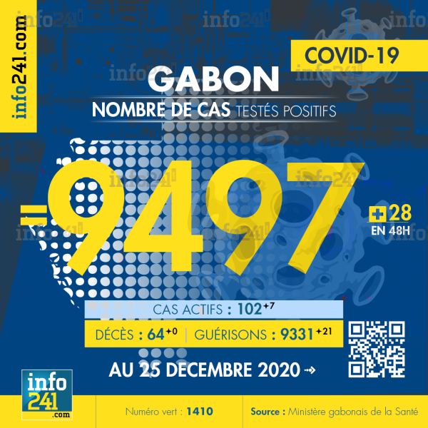 Ce qui porte le bilan à 9 497 cas confirmés, 64 décès et 9 331 guérisons. Le Gabon compte actuellement 102(+7) cas actifs de la pandémie officiellement déclarés. Parmi eux 3(-0) patients hospitalisés dans le pays dont 3(-0) en réanimation.