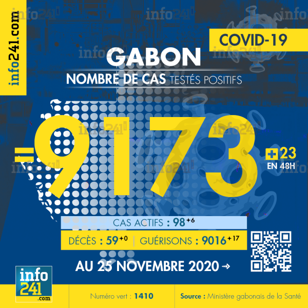 Ce qui porte le bilan à 9 173 cas confirmés, 59 décès et 9 016 guérisons. Le Gabon compte actuellement 98(+6) cas actifs de la pandémie officiellement déclarés. Parmi eux 8(-1) patients hospitalisés dans le pays dont 7(-1) en réanimation.
