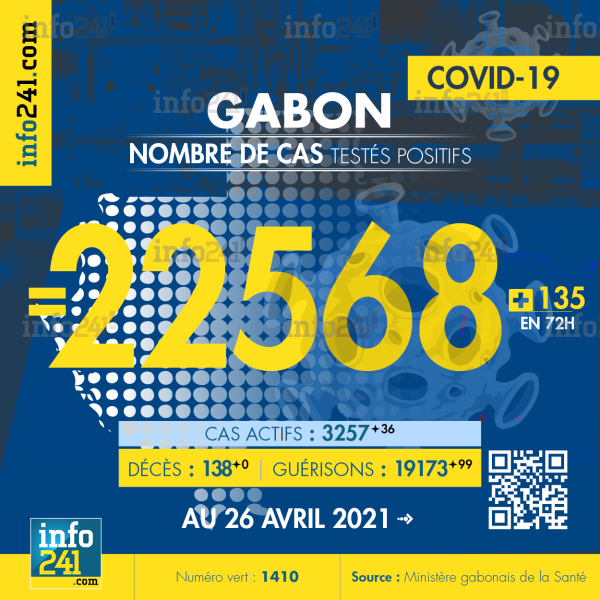 Ce qui porte le bilan à 22 568 cas confirmés, 138 décès et 19 173 guérisons. Le Gabon compte actuellement 3 257(+36) cas actifs de la pandémie officiellement déclarés. Parmi eux 69(-11) patients hospitalisés dans le pays dont 19(-3) en réanimation.