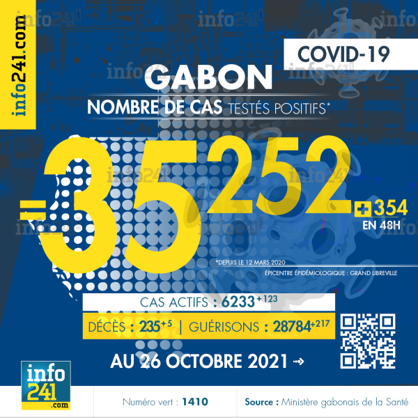 Ce qui porte le bilan à 35 252 cas confirmés, 235 décès et 28 784 guérisons. Le Gabon compte actuellement 6 233 (+123) cas actifs de la pandémie officiellement déclarés. Parmi eux 100 (-14) patients hospitalisés dans le pays dont 22 (-2) en réanimation.