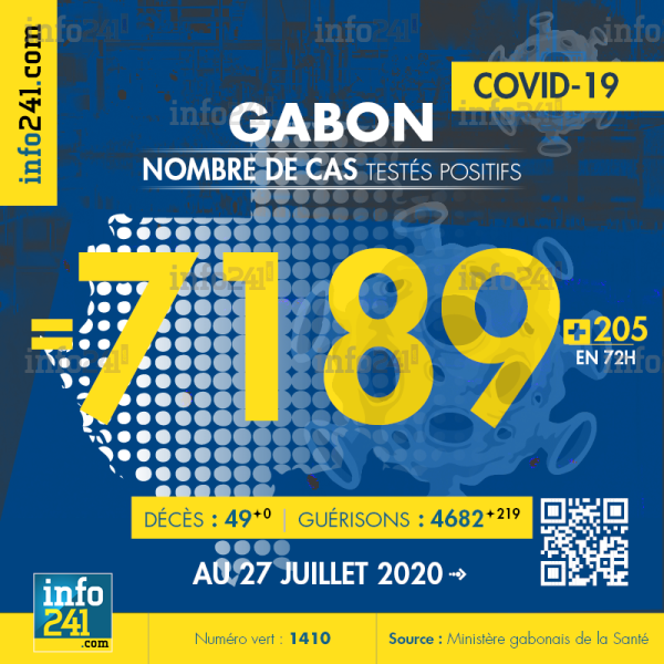 Bilan épidémiologique du Gabon au 24 juillet 2020 : 205 nouveaux cas enregistrés en 72h dans le Moyen-Ogooué (125 cas), l’Estuaire (67 cas), la Ngounié (7 cas), le Haut-Ogooué (4 cas) et le Woleu-Ntem (2 cas). Il y a eu aucun nouveau décès et 219 nouvelles guérisons.