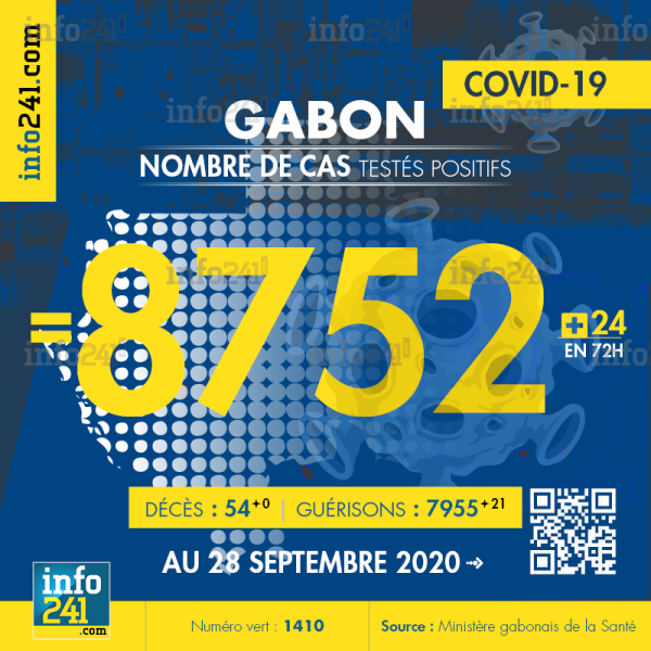 Bilan épidémiologique du Gabon au 28 septembre 2020 : 24 nouveaux cas enregistrés en 72h dans l’Estuaire (15 cas), l’Ogooué-Maritime (8 cas) et le Haut-Ogooué (1 cas). Il y a eu aucun nouveau décès et 21 nouvelles guérisons.