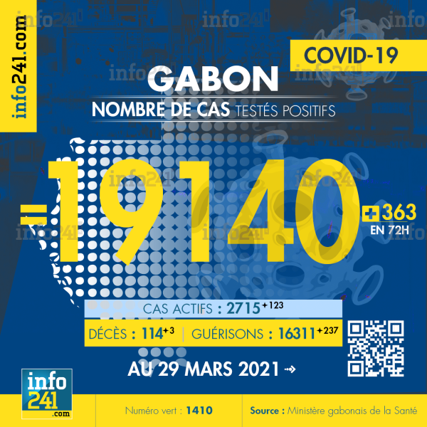 Bilan épidémiologique du Gabon au 29 mars 2021 : 363 nouveaux cas enregistrés en 72h dans l’Estuaire (178 cas), le Haut-Ogooué (147 cas), l’Ogooué-Lolo (18 cas), l’Ogooué-Maritime (14 cas), la Nyanga (3 cas) et l’Ogooué-Ivindo (3 cas). Il y a eu 3 nouveaux décès et 237 nouvelles guérisons.