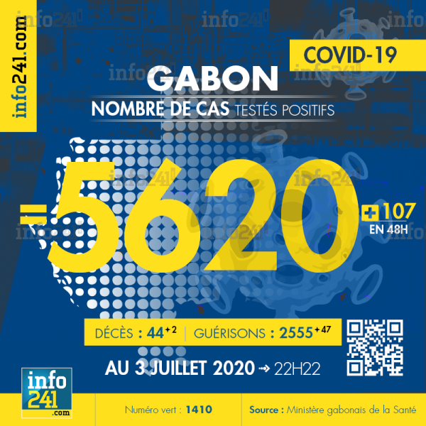 bilan épidémiologique du Gabon au 3 juillet 2020 : 107 nouveaux cas enregistrés en 48h dans l’Estuaire (82 cas) et l’Ogooué-maritime (25 cas). Il y a eu deux nouveaux décès et 47 nouvelles guérisons. Ce qui porte le bilan à 5 620 cas confirmés, 44 décès et 2 555 guérisons. Il y a actuellement 3 021 cas actifs. Parmi eux 55(-1) patients hospitalisés dans le pays dont 10(+0) en réanimation.