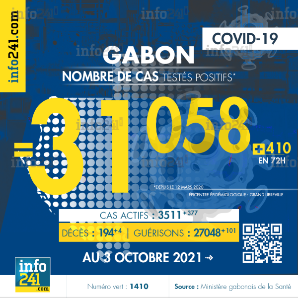 Bilan épidémiologique du Gabon au 3 octobre 2021 : 410 nouveaux cas enregistrés en 72h dans l’Estuaire (366 cas), l’Ogooué-Maritime (17 cas), le Haut-Ogooué (10 cas), le Moyen-Ogooué (9 cas), le Woleu-Ntem (3 cas), la Ngounié (2 cas), l’Ogooué-Ivindo (2 cas) et l’Ogooué-Lolo (1 cas). Il y a eu 4 nouveaux décès et 101 nouvelles guérisons.