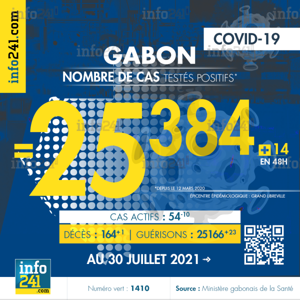 Bilan épidémiologique du Gabon au 30 juillet 2021 : 14 nouveaux cas enregistrés en 48h dans l’Estuaire (11 cas), l’Ogooué-Maritime (2 cas) et la Nyanga (1 cas). Il y a eu un nouveau décès et 23 nouvelles guérisons.