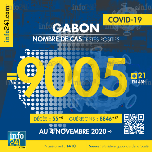 Bilan épidémiologique du Gabon au 4 novembre 2020 : 21 nouveaux cas enregistrés en 48h dans l’Estuaire (14 cas) et l’Ogooué-Maritime (7 cas). Il y a eu aucun nouveau décès et 67 nouvelles guérisons.