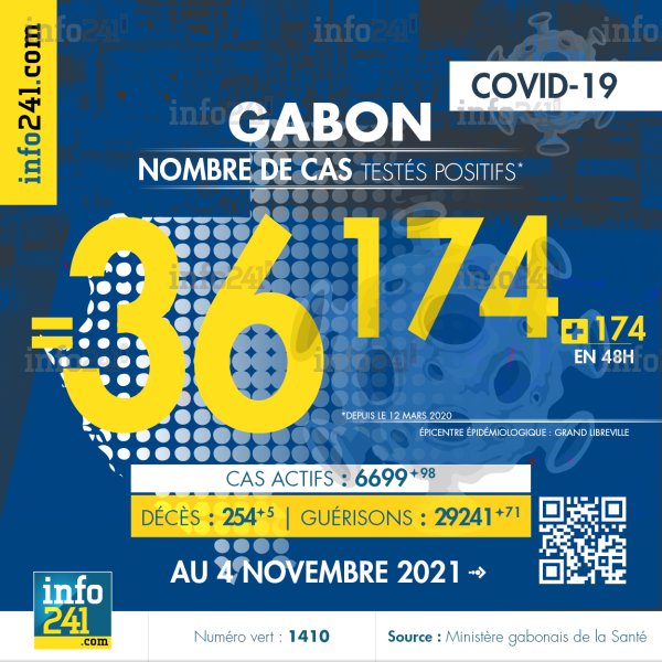 Bilan épidémiologique du Gabon au 4 novembre 2021 : 174 nouveaux cas enregistrés en 48h dans l’Estuaire (139 cas), l’Ogooué-Maritime (16 cas), le Haut-Ogooué (10 cas), l’Ogooué6Ivindo (5 cas), la Nyanga (2 cas), l’Ogooué-Lolo (1 cas) et la Ngounié (1 cas). Il y a eu 5 nouveaux décès et 71 nouvelles guérisons.
