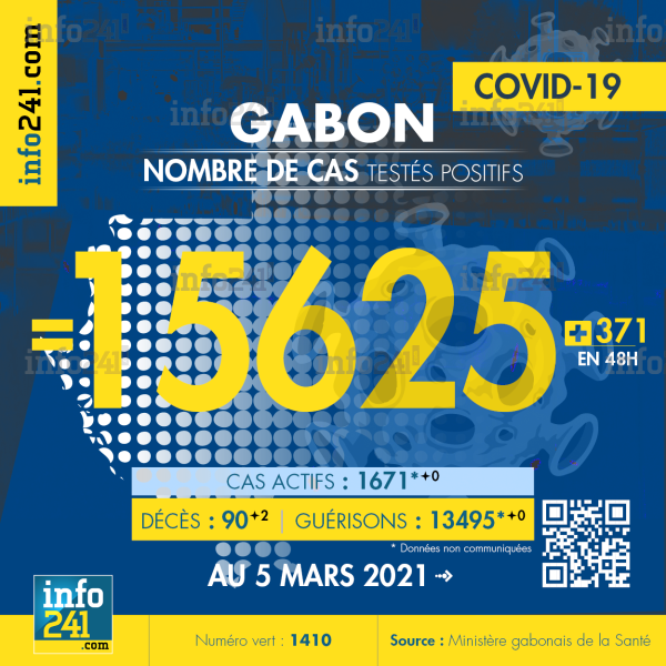 Bilan épidémiologique du Gabon au 5 mars 2021 : 371 nouveaux cas enregistrés en 48h dans l’Estuaire (264 cas), le Haut-Ogooué (36 cas), l’Ogooué-Maritime (32 cas) le Moyen-Ogooué (23 cas), la Nyanga (10 cas), l’Ogooué-Ivindo (3 cas) et le Woleu-Ntem (3 cas). Il y a eu 2 nouveaux décès.
