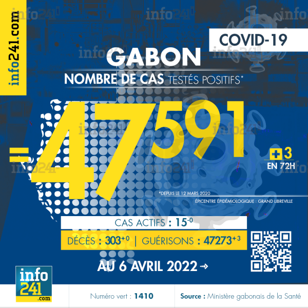 Ce qui porte le bilan à 47 591 cas confirmés, 303 décès et 47 273 guérisons depuis le 12 mars 2020. Le Gabon compte actuellement 15 (-0) cas actifs de la pandémie officiellement déclarés. Parmi eux 0 (+0) patients hospitalisés dans le pays dont 0 (+0) en réanimation.