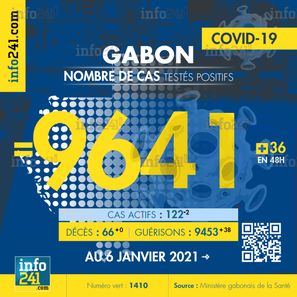 Ce qui porte le bilan à 9 641 cas confirmés, 66 décès et 9 453 guérisons. Le Gabon compte actuellement 122(-2) cas actifs de la pandémie officiellement déclarés. Parmi eux 7(-1) patients hospitalisés dans le pays dont 6(-1) en réanimation.