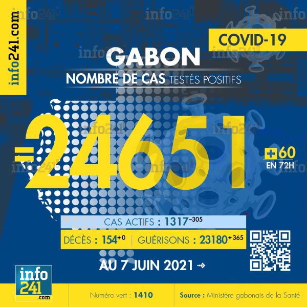 Ce qui porte le bilan à 24 651 cas confirmés, 154 décès et 23 180 guérisons. Le Gabon compte actuellement 1 317(-305) cas actifs de la pandémie officiellement déclarés. Parmi eux 37(+1) patients hospitalisés dans le pays dont 17(-0) en réanimation.
