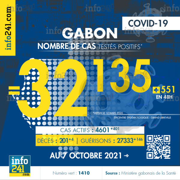 Ce qui porte le bilan à 32 135 cas confirmés, 201 décès et 27 333 guérisons. Le Gabon compte actuellement 4 601 (+401) cas actifs de la pandémie officiellement déclarés. Parmi eux 100 (-13) patients hospitalisés dans le pays dont 24 (-2) en réanimation.