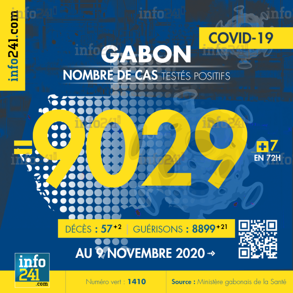 Bilan épidémiologique du Gabon au 9 novembre 2020 : 7 nouveaux cas enregistrés en 72h dans le Grand Libreville. Il y a eu 2 nouveaux décès et 21 nouvelles guérisons.