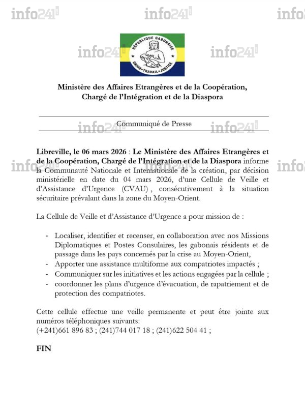 Face à l’escalade des tensions au Moyen-Orient, le gouvernement gabonais prend des mesures préventives pour protéger ses ressortissants. Dans un communiqué de presse parvenu ce vendredi 6 mars à la rédaction d’Info241, le ministère des Affaires étrangères informe la communauté nationale de la création d’une Cellule de veille et d’assistance d’urgence (CVAU). Cette structure stratégique, actée par une décision ministérielle prise le 4 mars, vise à répondre avec réactivité à la dégradation de la situation sécuritaire dans cette zone de conflit.