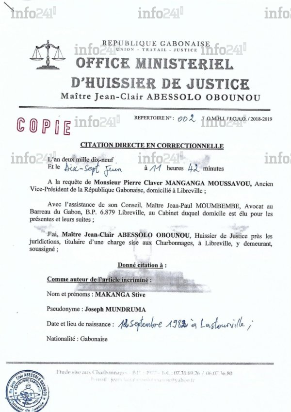 Selon un document d’huissier dont Info241 a obtenu copie, le journaliste est poursuivi pour « outrage par voie de presse » avec une amende record de près d’un milliard de nos francs exigée en réparation. Dans cette citation directe qui lui a été délivrée hier en mains propres, le journaliste est sommé de se présenter au procès qui s’ouvrira le 26 juin au tribunal correctionnel de Libreville faute de quoi « un jugement par défaut ou réputé contradictoire sera rendu contre lui sur la base des seules prétentions de son adversaire ».