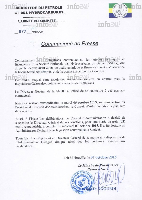 Que se passe t-il donc au sein de l’entreprise nationale créé en 2011 par Ali Bongo ? Pourquoi son directeur général se refuse à un audit en vue pourtant de « s’assurer de la bonne tenue des comptes et de l’exécution des contrats » ? L’audit ayant été initié depuis avril 2015 dans l’entreprise, pourquoi avoir attendu octobre 2015 pour prendre des mesures à l’encontre de l’insoumis directeur général ?