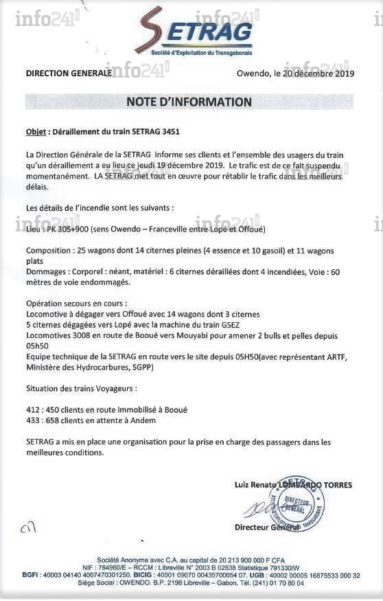 Selon un communiqué de presse de la compagnie, parvenu ce vendredi à la rédaction d’Info241, l’incident se serait produit ce jeudi 19 décembre peu après 23h35 entre les gares de la Lopé et d’Offoué, plus exactement au PK305. Le train accidenté n°3451 appartenait à la compagnie de transport. Il est composé de 25 wagons dont 14 citernes contenant de l’essence (4 wagons) et du gas-oil (10 wagons).