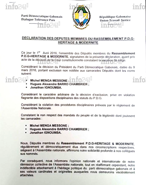 Par conséquent nous informons à l’opinion nationale et internationale affirmons de notre démission collective de l’Assemblée nationale. Tout en réaffirmant cependant notre indéfectible attachement à l’héritage politique du parti démocratique gabonais et à ses valeurs cardinales et originelles auxquelles nous demeurons viscéralement attachés du PDG. »