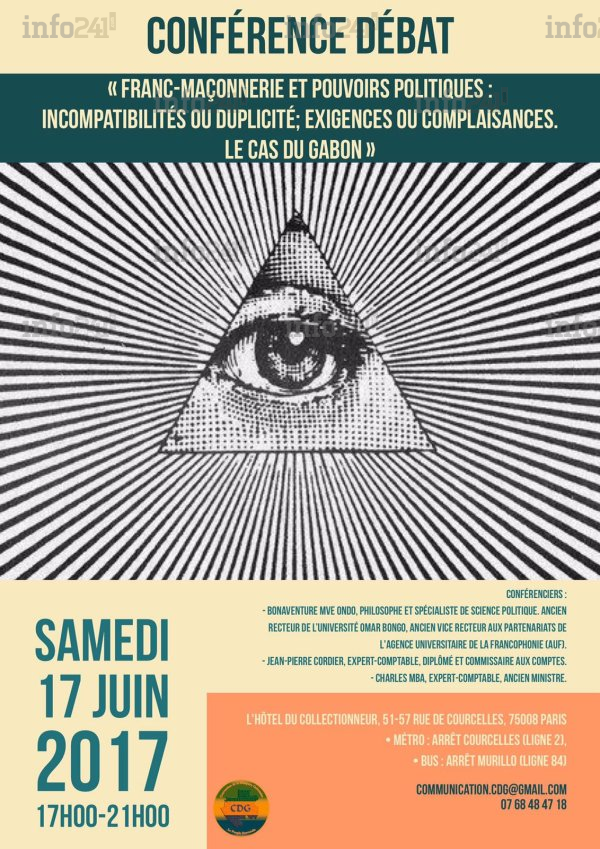 La diaspora gabonaise semble vouloir briser les tabous qui confisquent leur pays. A cet effet, La Convention de la Diaspora Gabonaise (CDG) organise une conférence le samedi 17 juin 2017 à Paris (Hôtel du Collectionneur 51-57 Rue de Courcelles, 75008 Paris ) , autour du thème : Franc-maçonnerie et pouvoirs politiques en Afrique : incompatibilités ou duplicité ; exigences et complaisances. Le cas du Gabon.