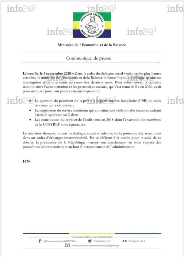 « Le ministère de l’Economie et de la Relance informe l’opinion publique qu’aucune interruption [du dialogue social] n’est intervenue au cours des derniers mois », s’est défendu pour sa part le ministère dans son communiqué-réponse. Et pour preuve, les services de Jean Marie Ogandaga se disent ouverts « au dialogue social et informe de la poursuite de rencontres dans un cadre d’échanges interministériels ».
