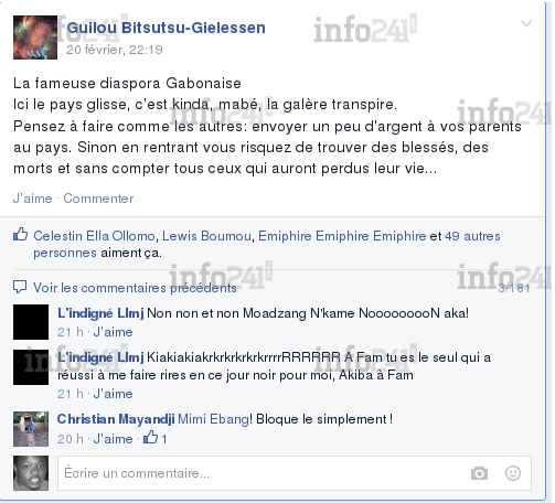Réponse à Guilou Bitsutsu-GielessenGrand frère BitsutsuDans une chronique d’Info kinguelé, vous avez publié un post à charge contre la diaspora gabonaise la traitant de ‘‘ la diaspora la plus inactive économiquement envers son pays d’origine’’Sauf erreur de ma part, il me semble que vous aviez été étudiant à l’université de Paris 1 Panthéon Sorbonne boursier aux frais du contribuable gabonais.J’ai cru lire là une attaque venant d’un gabonais émergent d’occasion, mais c’est à mon triste étonnement total que je reçois un tir venait d’un élément de nos rangs bref.Fort de ce qui précède voici quelques questions :Lorsque vous étiez étudiant à Paris, combien avez vous envoyé au pays ?De quelle manière aviez vous soutenu l’économie gabonaise, sinon dès à présent combien de gabonais avez vous aidé à s’émanciper économiquement ou socialement ?J’aimerais d’abord vous édifier sur plusieurs fait à décharge contre votre diatribe à consonance émergente :Tout d’abord la diaspora gabonaise est composée de 70% d’étudiants censés rejoindre le pays à la fin de leurs études. Puis le reste est diversifié entre ceux qui sont venus s’installer et ceux qui sont restés après études.La diaspora est un groupement de population gabonaise vivant hors du pays qui est à l’image du peuple autochtone, un peuple opprimé et oppressé par la présence au sommet de l’Etat d’une famille politique, ethnique, sectaire qui gère tous les circuits économiques du pays.Plus de trois tiers du PIB est géré par la famille Bongo et leurs suppôts, 98% des entreprises privées sont directement liés au président et à sa bande par des lois informelles préétablies en norme de copinage économique.Des lois et divers règlements (arrêtés et décrets) promulgués à promouvoir les intérêts du clan et à le protéger de la concurrence, tel que le décret contre l’importation des véhicules de plus de trois ans, visant à réduire l’indépendance et le commerce de la diaspora d’Europe et des USA, et surtout afin d’accroitre le chiffre d’affaire des concessions automobile Ford et Volvo Gabon etc… sociétés appartenant à Ali Bongo et son frère ainsi qu’à d’autres membres du clan.Des avantages fiscaux spécifiques aux « entre nous même nous même ». La grande part du bénéfice du secteur privé revient directement aux Bongo, les différents Ports et Rades sont gérés par eux même alors que c’est à l’Etat de tenir ce genre de monopole naturel qui est un gage de souveraineté et de création d’emplois et de richesses.Le Capitalisme de copinage dit on (crony capitalism) est édifié en norme primaire, les amis du président qui lui font écho de l’état de l’économie en fonction de la santé de leurs entreprises jouissant pour la plupart des monopoles (celui ci l’expliquait dans une interview à la Tv nationale) profitent du pays à vive allure délaissant ainsi le consommateur dans la dictature des prix inamovibles justifiant vulgairement la cherté de la vie quotidienne au Gabon.C’est dans ce contexte que depuis 1967, nous n’avons pas développé des richesses véritables, aucun gabonais n’est devenu riche par le commerce et la sueur du front sans être lié au clan, aucun gabonais ne s’est distingué en self made man comme Fotso ou Dangoté ou Bill Gate et consorts. La diaspora n’ayant pas une marge de manœuvre comme tous les gabonais éloignés au régime par ailleurs, ne peut être pointé du doigt ou encore moins être comparé à un malien ou camerounais qui par les efforts consentis par leurs gouvernants en matière de développement humain et égalité de chances ont permis de créer des mécanismes économiques d’émancipation individuelle.Je vais vous prendre l’exemple de mon grand frère vivant Paris entrepreneur dans le secteur de la sécurité de biens et des personnes : croyez vous Mr Bitsoutsou que celui ci peut venir concurrencer SGS ou Vigils Services (propriétés de Ernest Puoh Epigat et Hervé Opiangaha) ? Avant de lancer votre missile sol-sol envers la diaspora, en temps qu’ancien membre de celle ci vous auriez pu au moins vous renseigner sur les différents échanges de transfert de monnaie entre le Gabon et l’occident via les réseaux Union Western et MoneyGram à la proportionnelle du Mali et le Congo au lieu de venir vomir sur la place publique un post aussi immature et irresponsable venant d’une personne aussi chevronnée en politique.le capitalisme de copinage est le principal obstacle que rencontrent les gabonais dans leur ensemble, les pedegistes orientent l’action de l’État au profit de leurs intérêts personnels il serait plus important pour un diplômé comme vous à combattre ceux qui dirigent que de diviser ceux qui souffrent.Un proverbe Fang dit ceci : ‘‘ainesse et sagesse ne sont as synonymes’’ point de citation.Avec tout mon respect grand.Pour une nouvelle République, que Dieu bénisse le GabonSerge Dibangou Yangari, Nice (France)