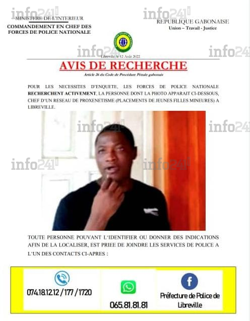 « Pour les nécessités d’enquête, les forces de police nationale recherchent activement la personne dont la photo apparait ci-dessous, chef d’un réseau de proxénétisme (placement de jeunes filles mineures) à Libreville », indique l’avis de recherche du commandement en chef de la police gabonaise. A première vue, il s’agirait d’un compatriote âgé d’une quarantaine d’années qui inciterait des jeunes filles encore mineures à se prostituer contre rémunération.