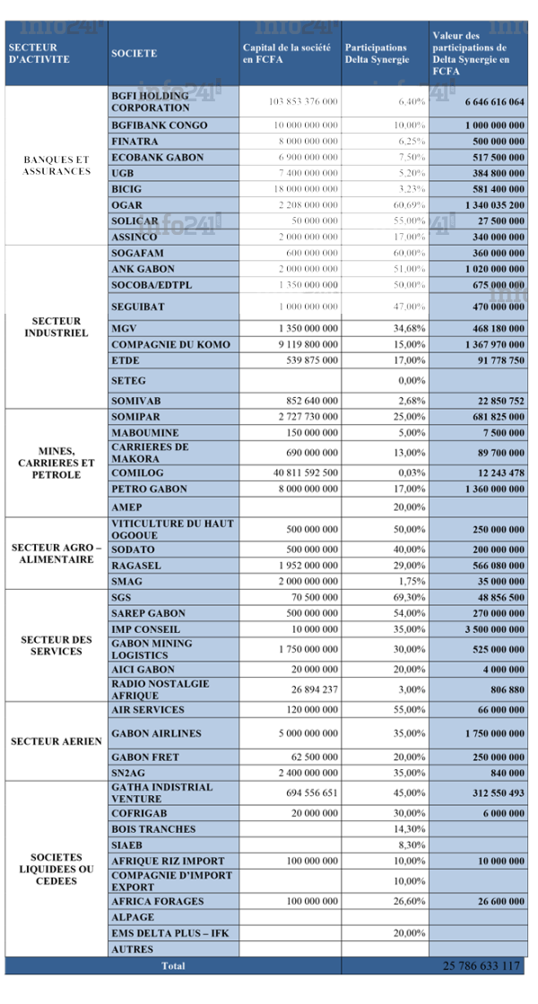Parmi ces entreprises, il y a la SEEG dont elle détient 7 % de parts ; la SOMIVA, filiale de la Setrag avec près de 2,68% soit une participation de 22 850 752 FCFA ; l’UGB (5,20 % soit à peu près 384 800 000FCFA de valeur de participation) et, la SMAG, quant à elle, Delta synergie détient un capital de 1,75% soit un total de participation de 35 000 000 FCFA. Cette situation ne laisse pas indifférent les Gabonais et encore moins les principaux acteurs du processus de privatisation quand on sait l’impact d’une telle marchandisation des capitaux publics à titre gratuite alors qu’elle est censée apporter une plus-value dans l’économie gabonaise.